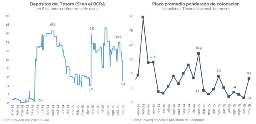 El dato central fue la decisión del Banco Central de recortar la tasa de interés desimultáneasde 25% a 22% TNA, en la antesala de una licitación del Tesoro que enfrentaba vencimientos por $7 billones (bn). En esta, se ofrecieron únicamente instrumentos de plazo largo —el más corto a febrero de 2026—, logrando extender duration —con un plazo cercano a los 8 meses; ver gráfico derecho—, absorber pesos y alcanzar un rollover del 111%, lo que fortaleció levemente su posición de depósitos de cara a vencimientos relevantes —$16 bn en lo que queda de noviembre y cerca de $40 bn en el último mes del año—, en un contexto en el que la caja venía muy ajustada (ver gráfico izquierdo). Además, la tasa promedio de las Lecaps quedó en 2,53%, por debajo del 2,87% de la licitación previa, volviendo a niveles de comienzos de año y reforzando la señal de normalización.