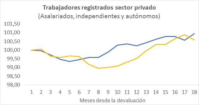 En materia de empleo no se han podido sacar ventajas. Muchos sindicalistas probablemente estarán sorprendidos, pero a 18 meses de cada devaluación (seis trimestres) el nivel de empleo es el mismo en ambos casos. Esto es teniendo en cuenta todos los trabajadores registrados con excepción de los empleados públicos: Asalariados privados, asalariados de casas particulares, independientes autónomos y monotributo.