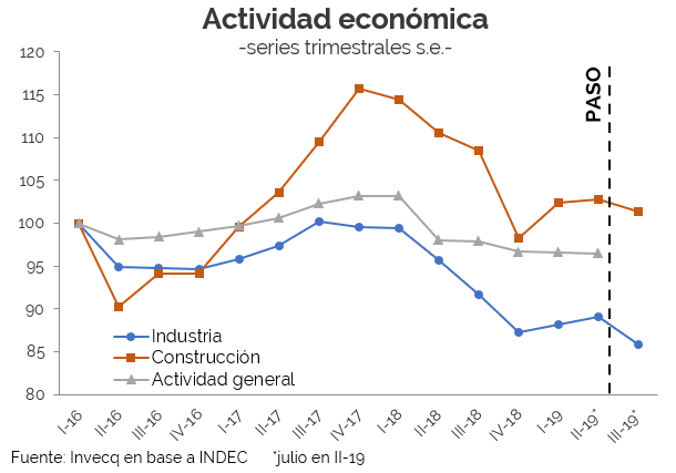 La industria manufacturera tuvo en septiembre una caída del 5% en relación al mes inmediatamente anterior (cuando ya había tenido una contracción del 3,4% con respecto a julio) y la actividad de la construcción disminuyó en 4,6% en el mismo mes. Así, comparando el promedio de actividad durante los meses de agosto-septiembre con el de los meses de abril-julio se observa una caída del 3,6% en la industria y del 1,5% para la construcción. A la luz de los datos de actividad general de agosto (contracción del 1%) y de estos dos sectores, es esperable que la economía en su conjunto esté cayendo nuevamente desde las elecciones PASO.